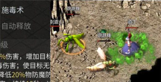 施毒术:道士核心的伤害技能。对目标挥出剧毒,造成伤害的同时使敌人进入长时间的中毒状态,降低防御和魔防,不断地受到体内毒药的损伤。这个技能不仅能造成可观的伤害,还能提高己方的输出效果。并且,剧毒还能令怪物血气阻塞,无法恢复生命,大大提高了刷怪的效率。