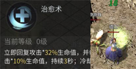 治愈术:道士的灵魂技能,运用自然之力,使自己和队友瞬间回复大量生命值,并且在接下来的短时间内持续恢复一定的生命值。正是有着这强大的治疗能力,道士才能作为各种战斗中都不可或缺的成员。