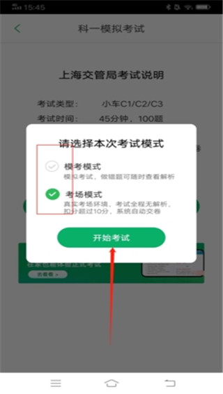 3、有模考模式和考场模式两种考试模式可以选择,选择完毕后,再次点击“开始考试”;