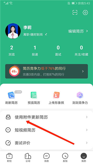 2、进入到个人中心界面,选择“使用附件更新简历”选项,