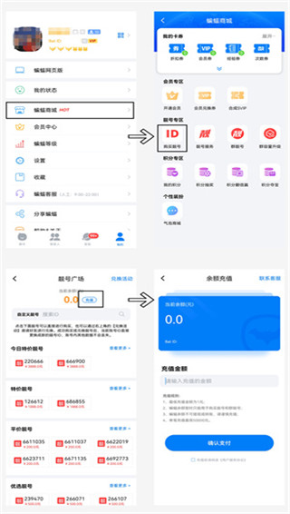 安卓用户:在【我的】页面,进入【商城】,点击【购买靓号】,在靓号广场充值余额。