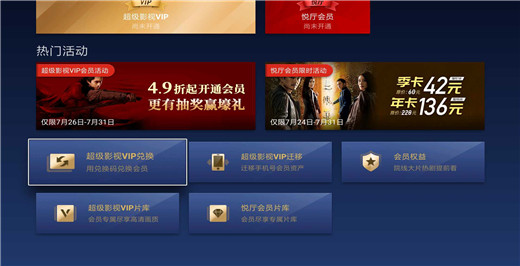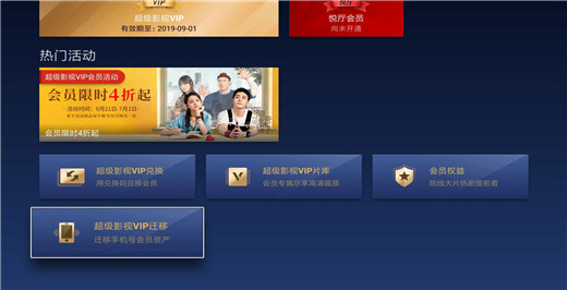 2.进入会员中心后,按遥控器下键,找到超级影视VIP迁移入口,并点击进入迁移界面;