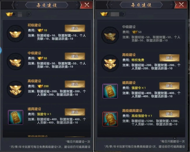 联盟中每人每天只能选择一种建设,如果开启了月、季、年卡,则可以使用特权建设,特权建设和高级建设的效果一致,且不需要消耗元宝,并且进行特权建设后还可以进行道具建设;