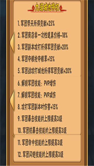 目前的军团城池一共九级,每升级一次,全体军团成员都可获得相应的城池特权,享受丰厚福利。等级越高,特权越大,福利也越好。