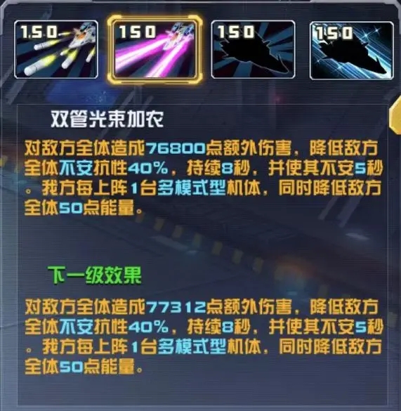 战斗开始前30秒,降低敌方全体攻击频率25.0%,我方每上阵1台多模式型机体,额外降低攻击频率5%。