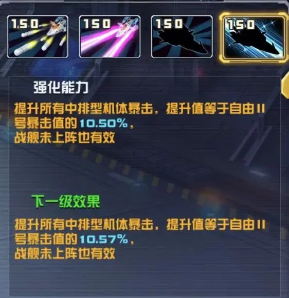 提升所有中排型机体暴击,提升值等于自由Ⅱ号暴击值的10.50%,战舰未上阵也有效。