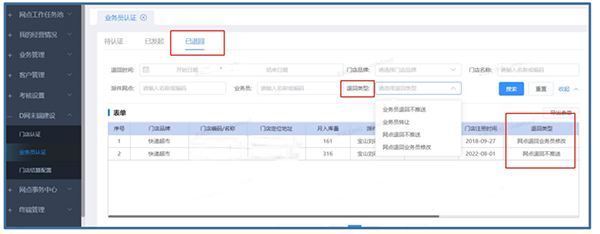 (4)网点退回业务员修改:网点选择【退回-业务员修改数据】