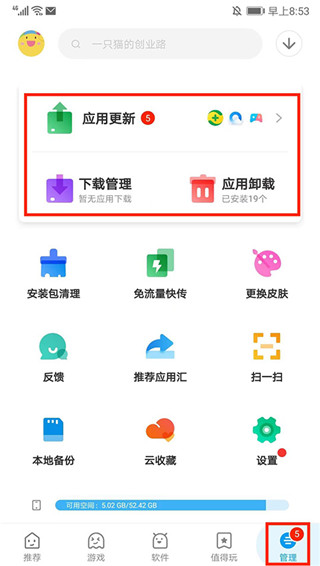 8、进入管理界面,可进行应用更新、下载管理、应用卸载和设置等操作,以上就是应用汇旧版本的使用方法了。