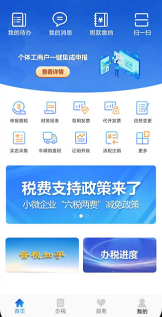 在首页集成了常用税务业务快捷入口,使用户能够一键直达所需服务。更多功能可在“办税”或“服务”页面找到。首页右上角头像处可跳转登录,"+"号图标提供搜索和扫码功能。