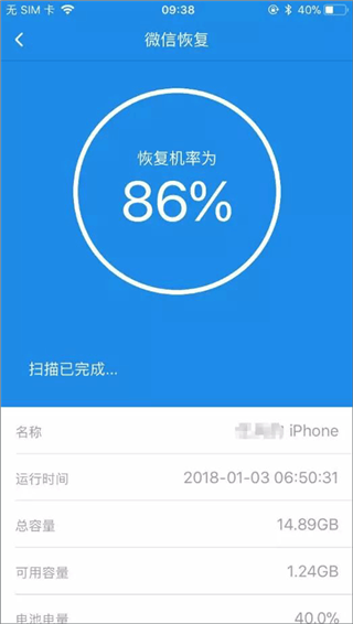 2、选择“微信恢复”选项,应用将开始扫描手机,完成扫描是恢复操作的前提。