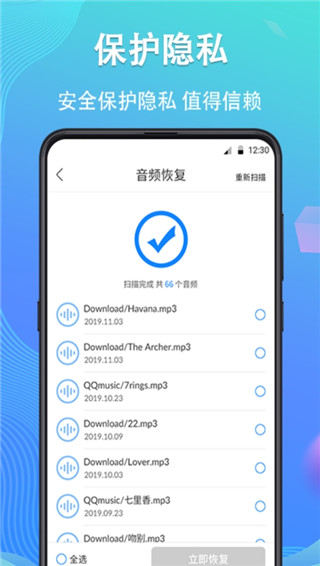 对手机内的所有音频文件进行深度扫描,包括语音记录和社交媒体音频,一键导出便捷。