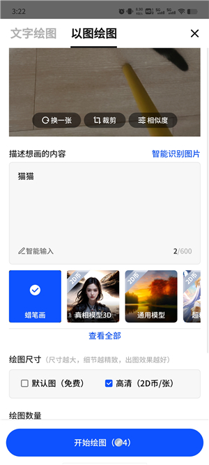 输入绘图主题和风格,点击开始,软件即将根据您的图片和文字描述进行创作。