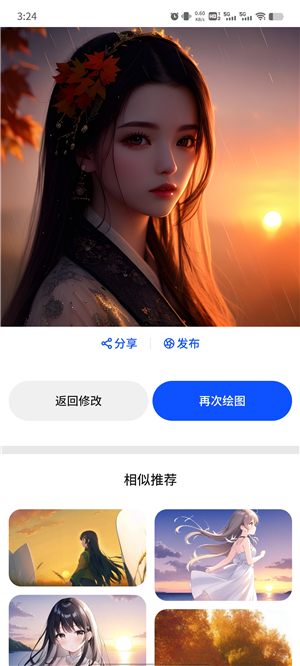 1、输入文字描述进行AI绘图。例如,描述“秋天、下雨、傍晚、夕阳”,系统将生成与这些主题相关的精美图像。