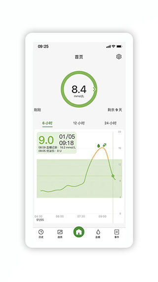 1、主界面直观显示最新的血糖读数及其记录时间,并可查看过去6小时、12小时或24小时的血糖变化趋势图2、历史记录模块详细展示血糖提醒、重要事件以及血糖测量数据,便于用户回顾和分析