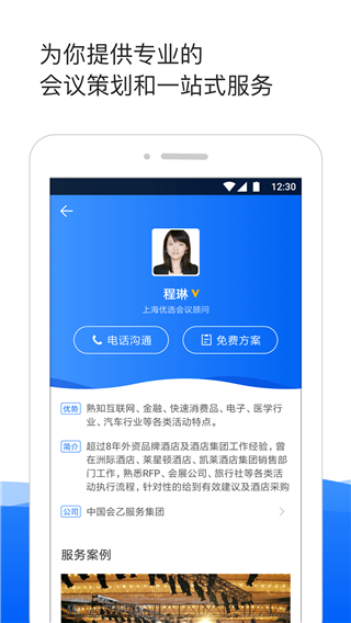 1、覆盖50个热门城市,提供专业的会议顾问服务,免费获取活动策划方案。2、作为国内最大的会场搜索与预订平台,提供全面的酒店和特色场地信息,包括档期、价格直接预订。