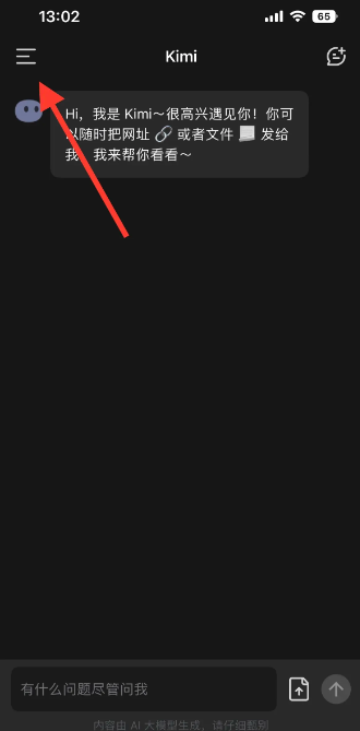 1、启动kimi智能助手app,点击界面左上角的菜单图标。