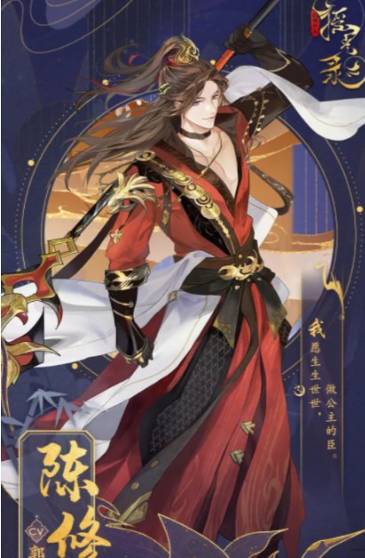 陈修,棕发红衣的深情狼狗。陈修这个角色最大的特色就在于忠诚和深情,他是陈家枪的继承人,性格霸道张扬但是对待外人却非常有礼貌,在东禹国的地位比较高,没接过家业之前就是一个小霸王。接过家族重担后好像立马就长大了,开启东虞之后的灿烂和辉煌。