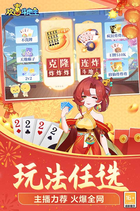 从经典三人斗地主到癞子、四人斗地主和疯狂炸蛋,多种玩法让你每一局都新鲜刺激。