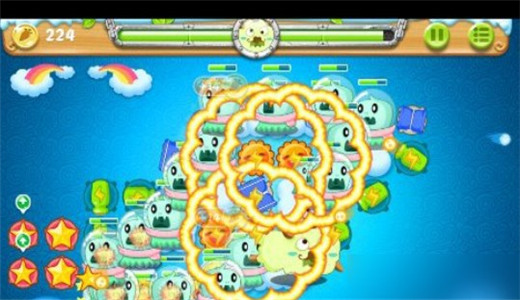左边的气球打掉以后,出现4个炸弹星,这4个炸弹星很重要,有钱就赶快升级。