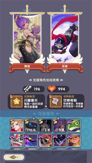 2、特别推荐作为支援角色的舞娘和忍者,他们的初始秘宝能提供无敌效果和抵挡伤害,极大提高了游戏的容错率。
