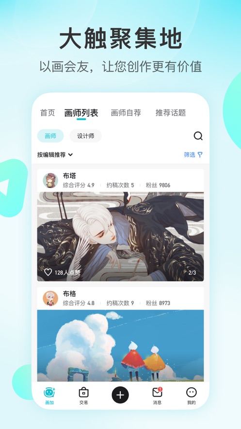 画加app最新版是一款汇集了众多优质画师的app,在这里用户可以进行约稿,该平台提供各种约稿方式,如个人约稿,商业约稿以及VIP约稿等,而且还可以欣赏到顶尖画师和各神仙大大的杰出作品,不仅可以与画师直接1对1在线交流,进行详细沟通并为其绘画工作提供报酬,还可以与心仪的画师专门进行定制化艺术创品。