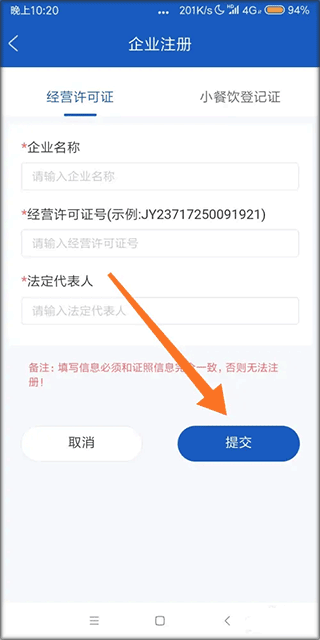 2、然后,如果你要使用经营许可证进行注册,则点击左边的选项,然后输入企业名称、经营许可证号和法定代表人,点击“提交”即可。