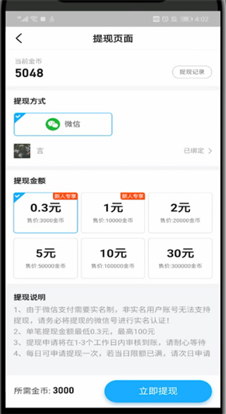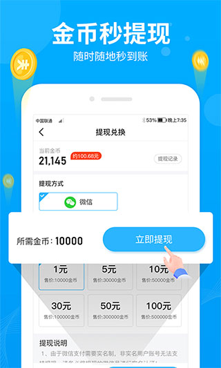 4、金币可即时提现,随时随地快速到账,方便快捷。