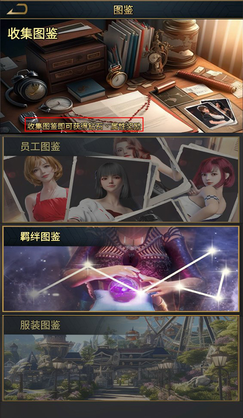 2、通过收集完整的员工图鉴,可以激活各种奖励,包括珍贵的钻石和属性加成。