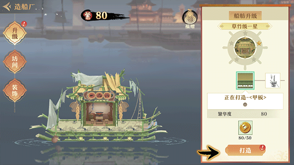 4、船舫升级:完成主线任务,可以解锁坊间,花费金币可以对坊间进行升级。