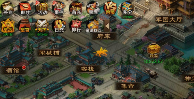 达到15级解锁城市战争,通过世界地图上的城战图标进入战场。亲身参与千人同屏的实时战斗,体验金戈铁马的战场风云,智取或武斗,团队协作体现游戏的策略与趣味。