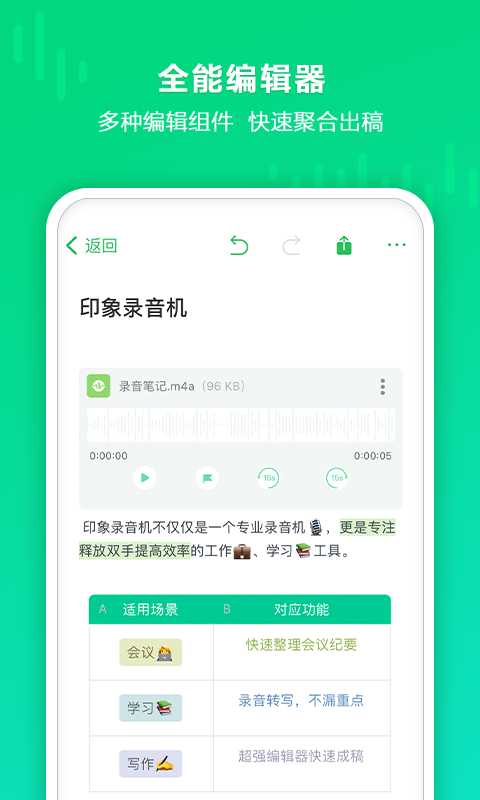 2、多功能编辑器:应用内集成了丰富的编辑工具,包括文字编辑、表格制作等,用户可以直接在应用中调整录音内容,大幅节省了转录时间和劳力。