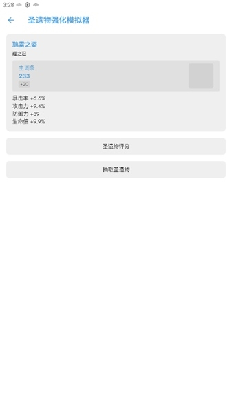 3、选择圣遗物评分,输入圣遗物名称获取详细信息及评分。