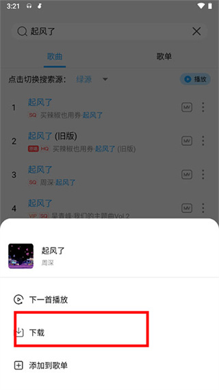 1、单曲下载在歌曲旁的更多选项中点击“下载”,之后选择所需的音质,歌曲即可被加入到下载队列中。