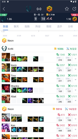 2、你可以看到比赛双方选手的各项数据,如击杀、经济等