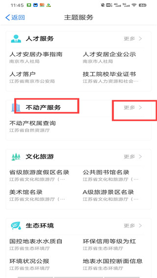 2、主题服务中,在不动产服务中点击更多;
