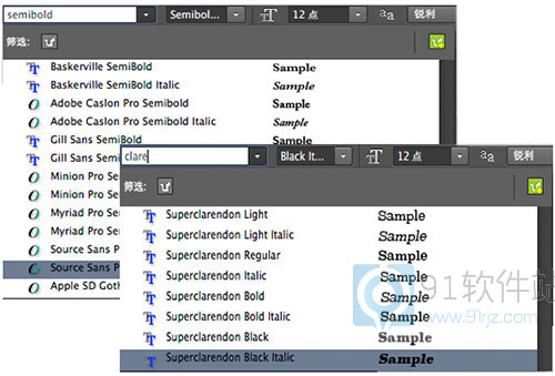 这是Photoshop CC 2014新增功能,现在您可以在文本工具选项栏和字符面板字体列表中快速搜索字体。键入所需字体系列的名称时,软件会对列表进行即时过滤。您可以按字体系列或按样式搜索字体。字体搜索不支持通配符。