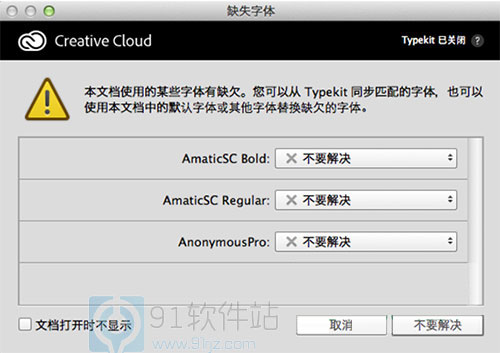 如果打开的文档中某些字体缺失,软件还允许您使用 Typekit 中的等效字体替换这些字体。