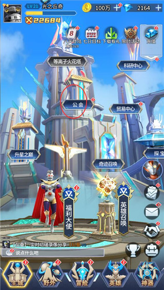 1、回到游戏的主城界面,在上方找到“公会”菜单
