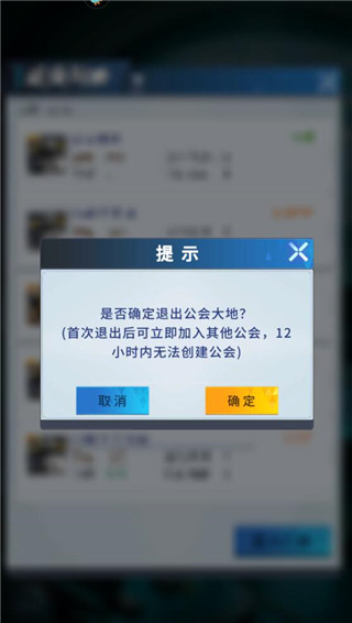 4、出现如下图提示,首次退出可以立即加入其他公会,不过12小时内无法创建公会,点击确定成功退出