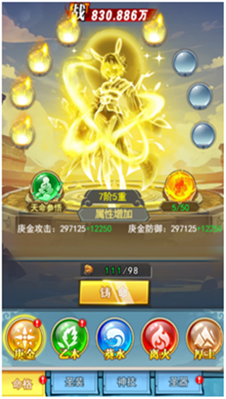 天命命格天命命格按照五行划分,由低到高分别为庚金、乙木、葵水、离火、厚土;当上一级命格达到对应的等阶时才会开启下一级命格;当命格升到对应等阶后,可以提升天命参悟来提升命格的属性,同时还有不同的命丹用于提升天命造化的等级。