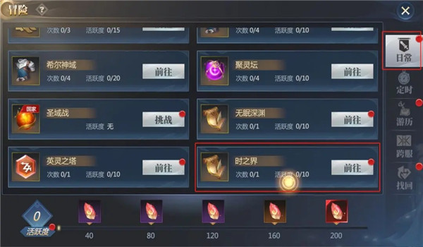 1、入口:游戏右上方【冒险】→【日常】(往下拉)→【时之界】