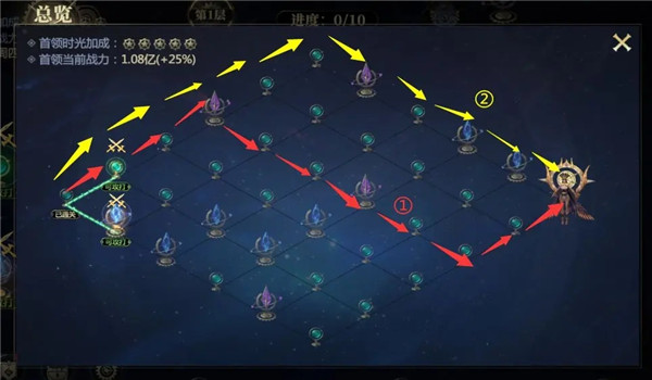 对于战力较低的无眠者,可以根据自身战力情况,先规划一条吃满BUFF的(蓝色)路线,然后再走奖励较多的关卡路线,这样既能降低Boss关卡的战斗力,也能获得不错的收益!但要切记最多只能降低5层Boss增益buff~