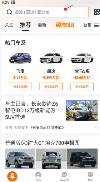 1、打开app,在首页平台会给你推送最新的汽车资讯。如果没有自己想要的,可以在上方搜索栏搜索。