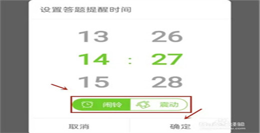 设置【答题提醒时间】,选择【闹铃】或【震动】,最后点击【确定】即可。