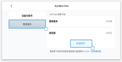 1. 连接遥控器后,在【设备管理】中,选择【增值服务】,点击【新建绑定】;