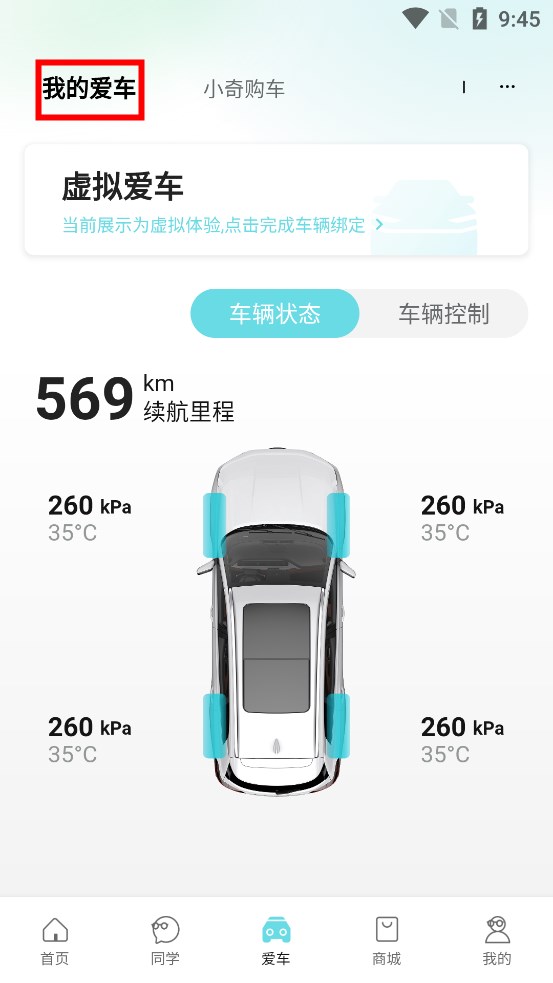 4、进入爱车页面后,点击选择左上角我的爱车