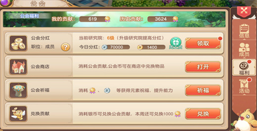 每周分红:成员将领取一份公会金礼盒,里面包含大量金币。