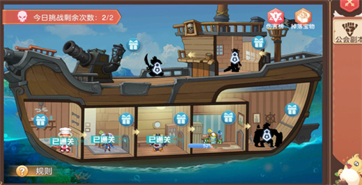 成员每日有两次挑战机会,战斗若在六回合内未结束,则会受到天罚神雷的攻击,导致所有参战角色和宠物死亡,此时系统会结算伤害并依此计算公会贡献值。完成结算后会更新公会排名。怪物的血量是全公会成员共享的,当所有怪物的血量清空后,将开启该关卡的终极BOSS战,最后一击击败BOSS的玩家将获得丰厚的战利品。