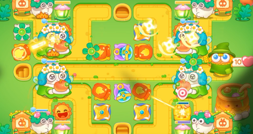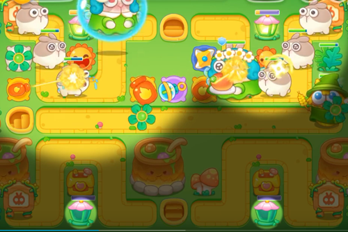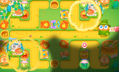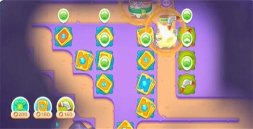 1、游戏初期,首先在萝卜周围布置两座卡牌炮台,这些炮台将为您清除附近的障碍物提供重火力支持。