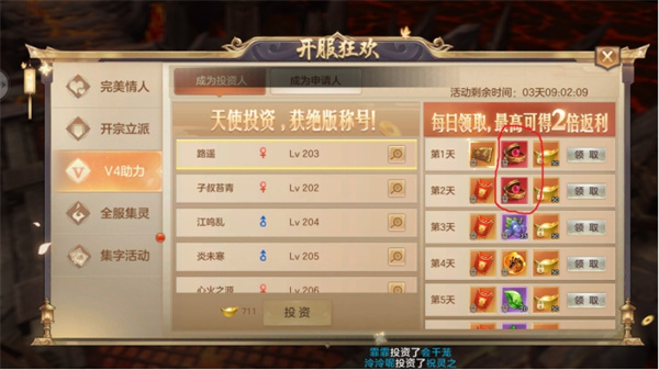 V4助力对我们等级冲榜的作用非常之大,因为在这个活动中他会赠送“仙阶经验丹”。仙阶经验丹的效果是250级以前使用直升1级,250级以后使用获得29.7亿经验。而且V4助力后,连续7天都可以领取奖励。从第二天开始可以领取元宝红包,打开后会获得120—150元宝。所以这个也是相当于免费的福利。